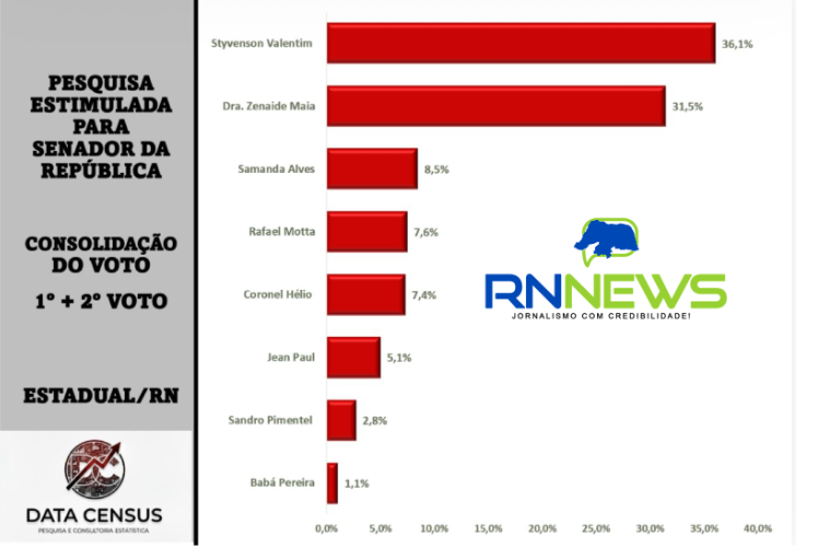 Política do RNStyvenson lidera com 36,1%; Zenaide Maia tem 31,5%; Samanda Alves, 8,5%; Rafael Motta, 7,6%; e Coronel Hélio, 7,4%