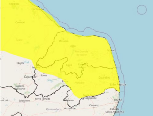 O alerta é da cor amarela, de perigo potencial, o nível mais baixo baixo do órgão, que conta ainda com os níveis laranja (perigo) e vermelho (grande perigo).