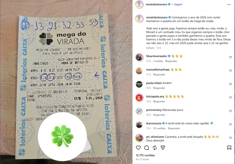 Foto: Reprodução O irmão do ex-presidente Jair Bolsonaro (PL), Renato Bolsonaro, divulgou em suas redes sociais, nesta sexta-feira (2), a foto de um bilhete da Mega da Virada premiado pela quadra – quando há o acerto de quatro números sorteados.…